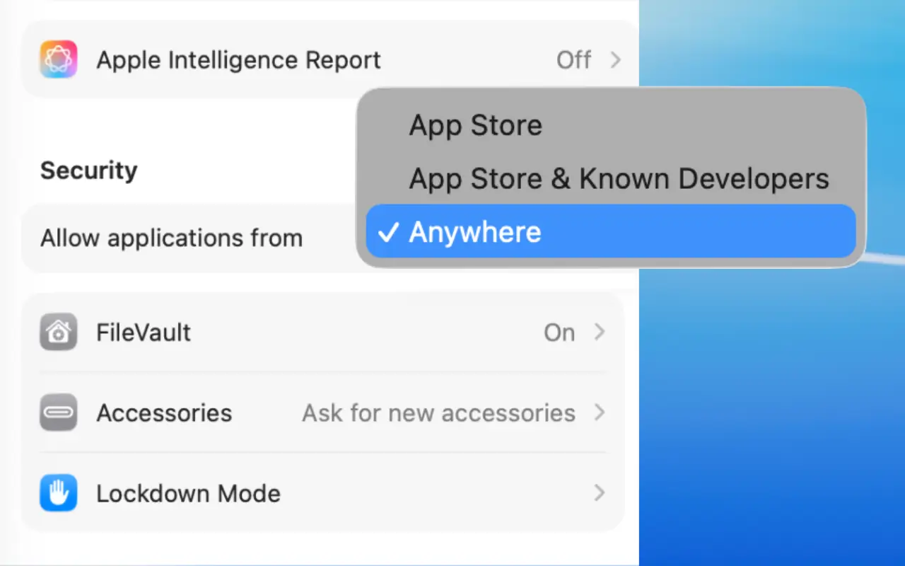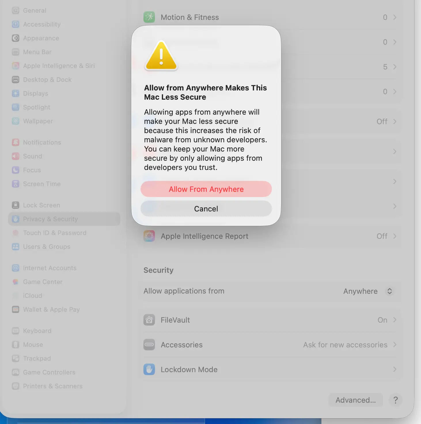 System Security setting «Allow Apps from Anywhere» | ⚠️ partially | ✅ | ✅ |