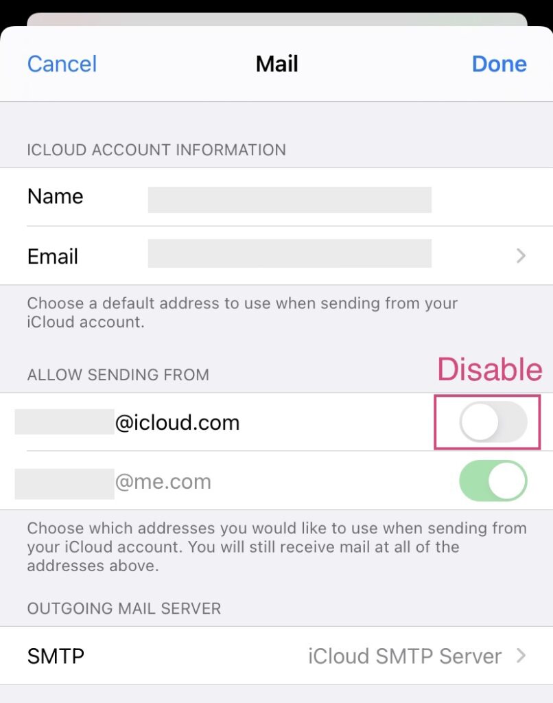 Disable secondary iCloud email sender address