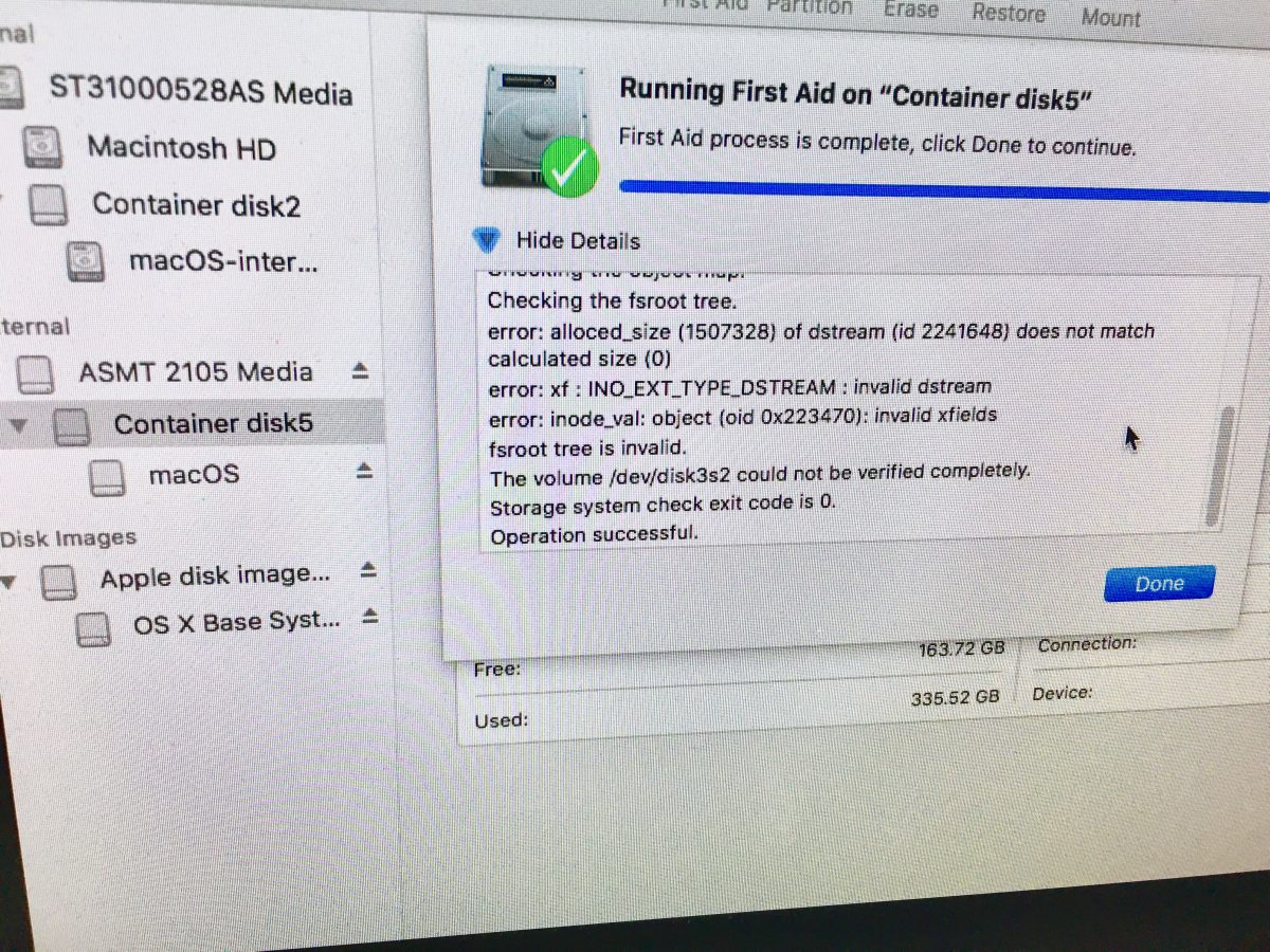 – in macOS and in Recovery Mode – can’t repair (aka First Aid) the volume; fsroot tree is brokenPhotos.app